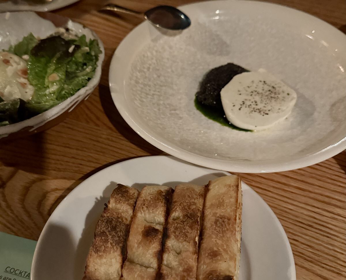 Along with cocktails, we ordered a few starters for the table. The Greener Roots Gem Lettuce salad had crunchy toasted almonds, crisp apples, and Manchego cheese topped with a tangy chardonnay vinaigrette. Also to start, we had an incredible and luxurious offering from their menu— their Burrata & Caviar: one ounce of Royal Belgian Osetra caviar served with the creamiest burrata, a bright herb oil and crispy toasted foccacia. It was a perfectly rich and wonderful couple of bites.
